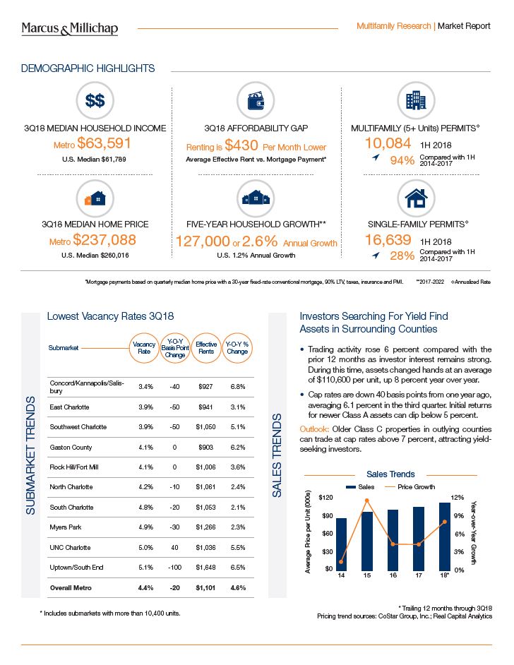 Marcus & Millichap released their 2018Q4 multifamily market report for Charlotte. The study finds that metro vacancy rates have declined 20 basis points to 4.4 percent over the past year while average rents have increased 4.6 percent. The researchers attribute this to the strong household formation (2.6 percent annualized) and economic growth (2.5 percent annualized) taking place in the greater Charlotte area.